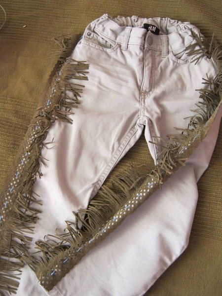 Trebuie să coaseți dungi cu franjuri pe pantaloni, confecționate dintr-un material cu lățimea de 5-10 cm. Alegeți lungimea singur - până la genunchi sau până la baza piciorului. Înainte de a atașa franjurile și a ajusta lungimea, costumul indian pentru băiat trebuie probat.