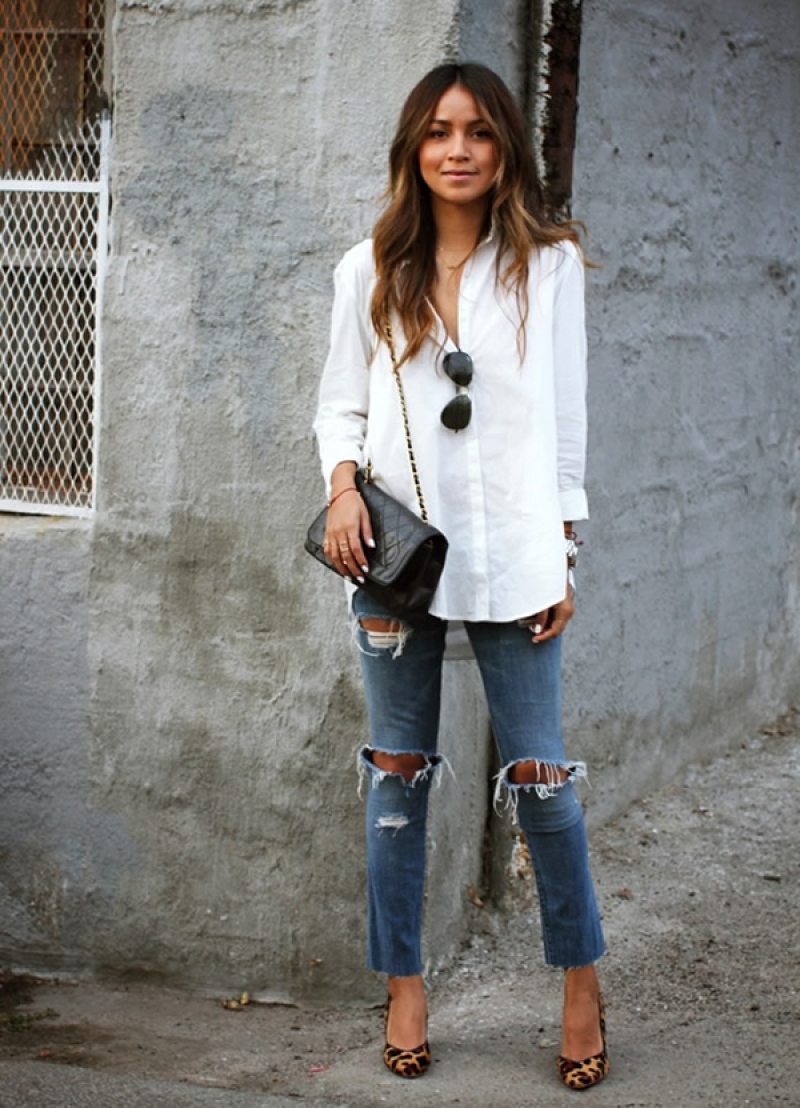 Cu cât topul este mai scump și mai prezentabil, cu atât mai atent trebuie decorate găurile. Imaginile cu blugi rupți, completate de jachete de statură, sunt una dintre tendințele la modă. Angajații moderni de birou, care nu sunt limitați de un cod vestimentar oficial strict, preferă să se îmbrace exact așa - la limita oficialității și a neglijenței creative. O altă tendință, mai brutală, ne învață să combinăm blugii rupți cu jachete de piele și atribute în stil militar. Tricouri kaki, cizme de luptă sau o versiune scurtată cu talpă aspră cu protecții - toate acestea vor crea un stil rebel, oarecum agresiv.