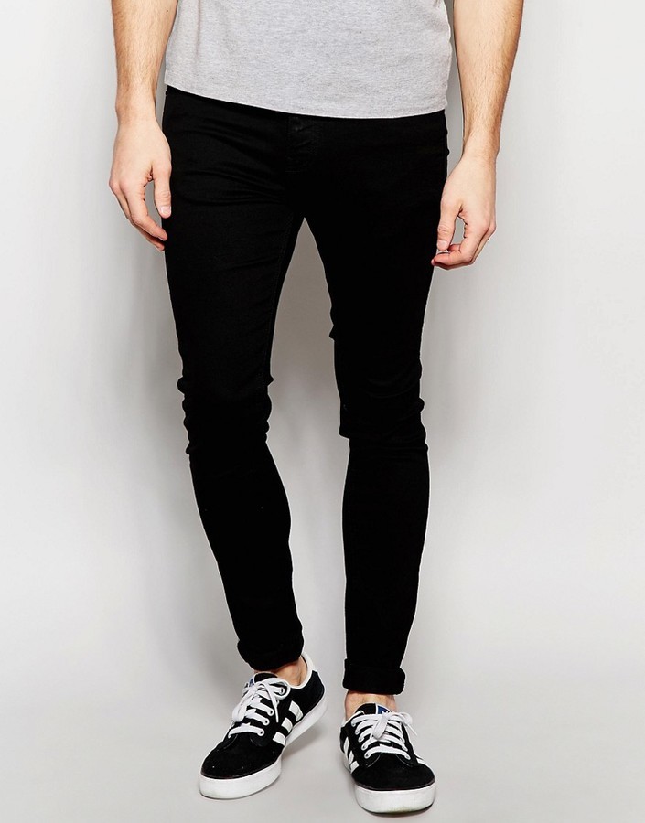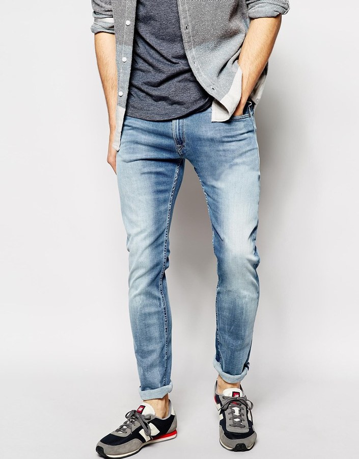 - Skinny Fit – blugi foarte strâmți, strâmți. Urmează contururile corpului. Doar cei cu o siluetă subțire și subțire pot purta astfel de pantaloni. Sunt foarte populari în rândul tinerilor. În același timp, mulți fani ai acestui model nici măcar nu știu cum se numesc blugii lor bărbătești preferați, conici până la bază. Persoanele plinuțe vor sublinia toate dezavantajele siluetei lor;