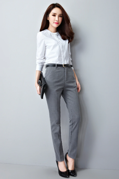 Opțiunile prezentate sunt clasice ale stilului oficial. Dar femeile pot alege și blugi evazați sau skinny, care sunt ideali pentru un look oficial. O soluție elegantă care nu va strica strictețea imaginii vor fi propunerile de designeri precum dungile sau nasturii. Alte opțiuni de decor nu sunt oferite.