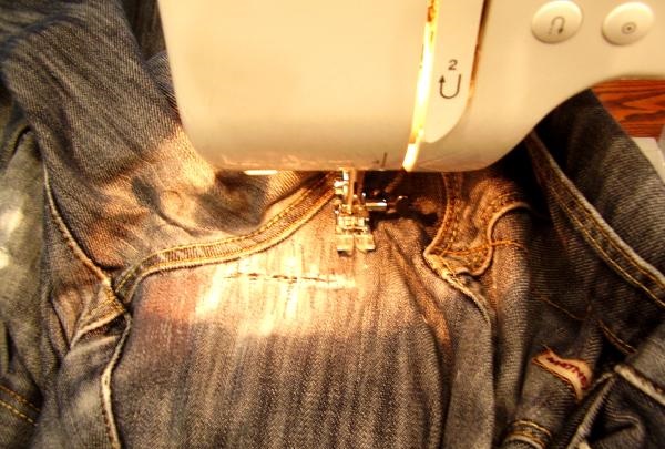 - După aceasta, gaura din blugi este cusută manual folosind cusături în zig-zag.