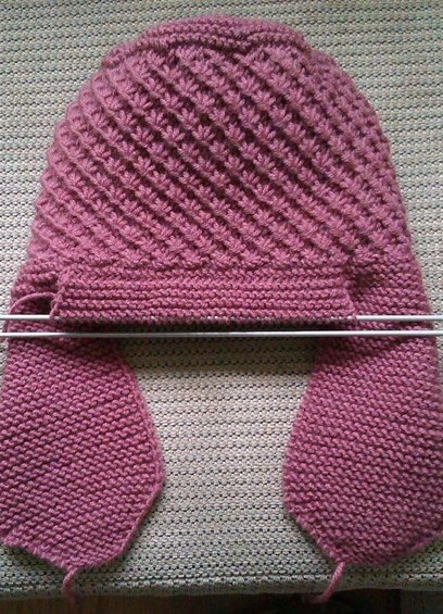 - Începeți să tricotați partea principală. Montați 15 bucle. Apoi ridicați 20 de la „urechea” dreaptă și tricotați 37 de bucle până la centru. Apoi urmează buclele „urechii” stângi și încă 17 bucle montate. Continuați să tricotați cu punct jerseu până la înălțimea dorită a pălăriei.