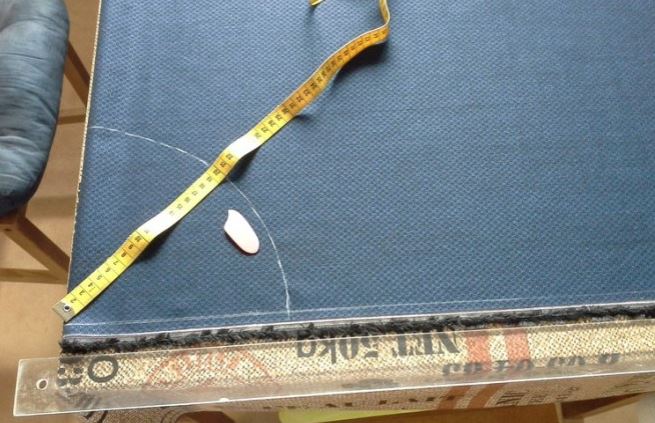 Modelul fustei semi-soare este desenat pe hârtie de calc. Trebuie pliată în jumătate. Mai întâi, se calculează raza cercului de-a lungul liniei taliei. Lungimea cercului poate fi determinată folosind formula R = OT / 6,28. Pe hârtia din colț, trebuie să plasați punctul A. De la acesta spre dreapta și în jos, se trasează segmente a căror lungime este egală cu raza obținută. Apoi, luați un compas, cu care aplicați pe hârtie o linie punctată a cercului cu aceeași rază.